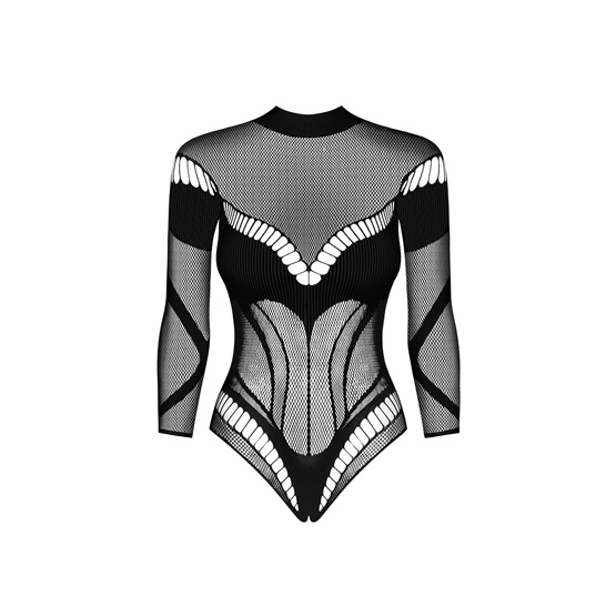 La malla delicada envuelve el cuerpo de forma agradable, marcando la silueta y realzando cada curva de forma natural. El recorte seductor en la espalda es uno de esos detalles que solo descubres cuando ya estás enamorado de la pieza — un elemento de sorpresa que nunca deja de funcionar. La entrepierna abierta completa un diseño sin concesiones.