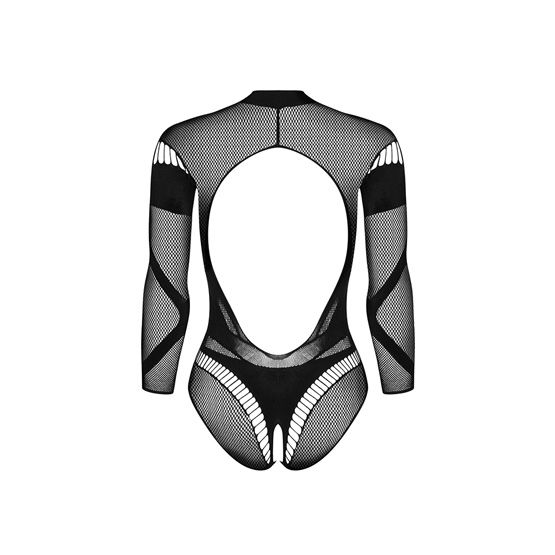 La malla delicada envuelve el cuerpo de forma agradable, realzando todos los activos de la figura. El recorte sensual en la espalda añade un elemento de sorpresa que no se ve hasta que la pieza está puesta — uno de esos detalles que solo descubres cuando ya es demasiado tarde para no quererlo. La entrepierna abierta completa un diseño que no deja nada sin pensar.