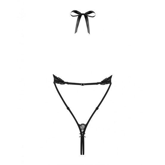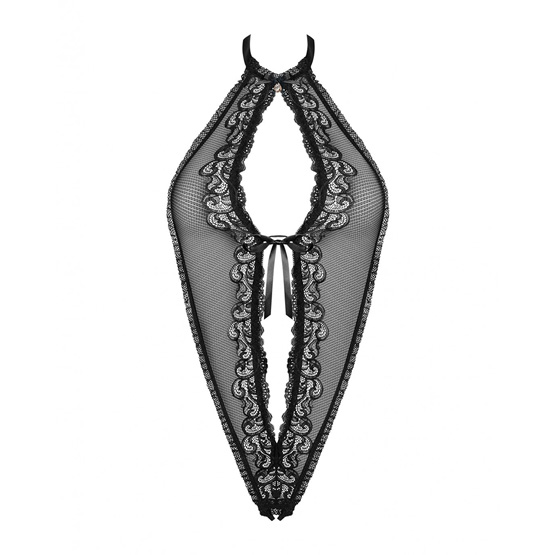 Body teddy con frontal abierto y con posibilidad de atar las dos partes, puedes usarlo tapada o destapada. Atado alrededor del cuello y brillante entre el pecho y el cuello. Los materiales son ajustados.