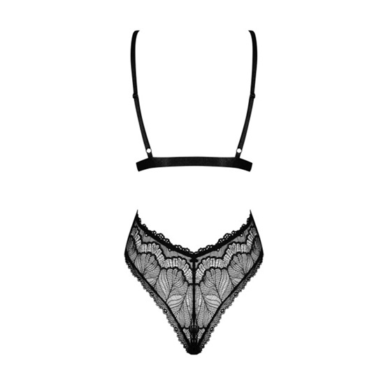 Vestit d'encaix negre amb copes triangulars del sostenidor, per a una bella aparença dels pits. Amb corretges ajustables per a un ús còmode. Té una cinta de setí amb un llaç sota el bust, que li dóna un toc elegant i aporta fixació frontal sota els pits. A més, compta amb un tall obert i longitudinal a l'abdomen, un preciós detall que cridarà l'atenció de qualsevol. L'esquena queda exposada. Material agradable al tacte.