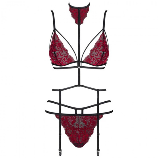 Conjunto de sujetador, choker y panties de red negra con patrones florales aterciopelados color vino. Sus tiras elásticas de color negro, unen todo el conjunto rodeando tu cuerpo creando un increible resultado.