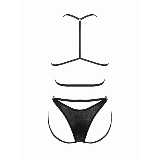 El conjunto Cobra Nive negro está formado por sujetador y braguita. El sujetador con copas triangulares le da una hermosa apariencia al busto. Tiene correas ajustables y tirantes asimétricos debajo del busto con posibilidad de ajuste: una silueta maravillosamente enfatizada. El sujetador con una cómoda hebilla abrochada debajo de los senos te garantiza una total comodidad. La línea de panty levantada con tiras decorativas te hará unas caderas muy sensuales. La braguita abrochada a los lados con hebilla dorada y las correas picantes debajo del trasero proporcionarán una experiencia inolvidable. Si estás de humor para una noche traviesa con tu ser querido, ¡con este atuendo tienes la garantía de conseguir uno!