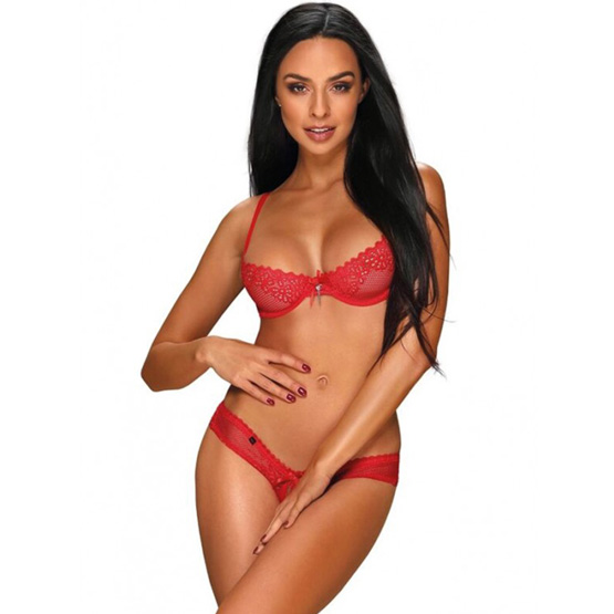 Set dos piezas de sujetador con aro y culotte abierto color rojo de la colección Alabastra. El sujetador dispone de tirantes y cierre ajustable para adaptarse al máximo a tu cuerpo y un sensual lacito entre los pechos. Su material de encaje, delicado y elástico te otorgaran un énfasis de sensualidad y atractivo sexual.