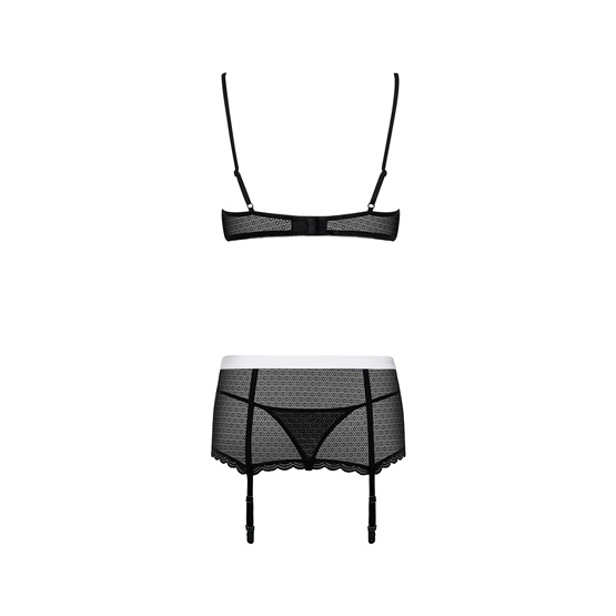 Set completo 5 piezas: sujetador + liguero con delantal + tanga + medias + diadema