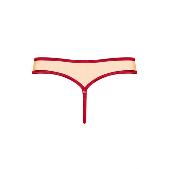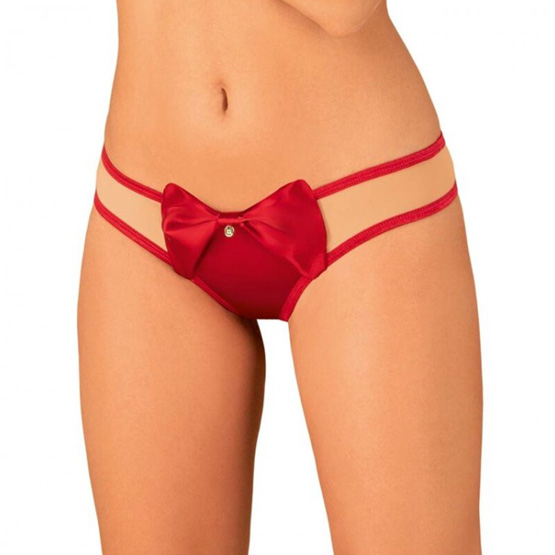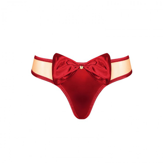 Tanga adornado con un lazo de satén y gema de plata. El rojo digno del pecado forma un arco encantador, y combinado con el colgante brillante lo hace un tanga sexy y elegante. Las correas rojas abrazan las caderas: curvas bien enfatizadas. El material nude contrasta suavemente con el rojo satinado, creando una combinación sexy de material delicado. ¡Solo sabemos que no puedes esperar!